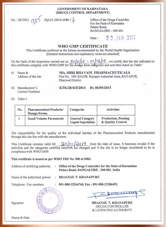 Shri Bhavani Pharmaceuticals is established in year 2014 by a reputed business family with a vision to establish a world class state of the art manufacturing facility specializing in manufacturing of Small Volume Parenterals with emphasis on Quality, Technology & Innovation. This facility has been built with latest technology and International standard complying with World Health Organization, PICS, ISO 9001:2008 and to manufacture Injectables for their worldwide customers.